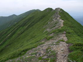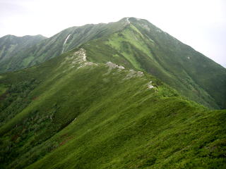 | P1399から見る一番近い峰。2.5万図に標高の記載はないが、帰宅後調べると標高1601m位のようです。山頂には『図根』と書かれた角柱がありました。三角点と同じような機能を持つもののようです。 |
