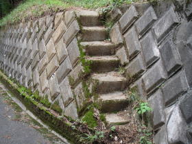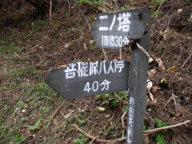 | 葛葉の泉のちょっと先の林道のゲートを過ぎたところにある二ノ塔への取付の石段と、石段上の道標。 |