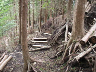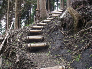| 戸沢に下る天神尾根の道は丸太でステップを付けたり、土留めをする工事をしてからあまり日時が経っていないようでした。昔の登山道が雨水に浸食されて谷のようになってしまい、歩けなくなってしまったところにも丸太による土留めがされていました。 |