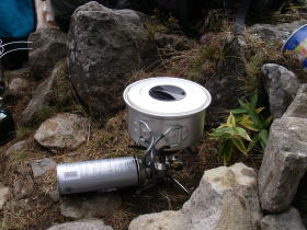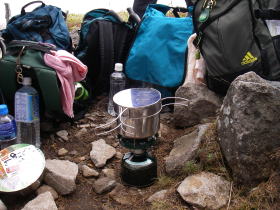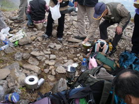 | 西篭ノ登山から東篭ノ登山に戻り、下山後、高峰温泉ホテルで遅い昼食をとることにしていましたので軽いカップ麺の昼食をとりました。バーナー3台でお湯を沸かしましたが随分時間がかかってしまいました。山荘の管理人に頂いた梨や林檎などもあり、気分的には豪華な昼食でした。 |