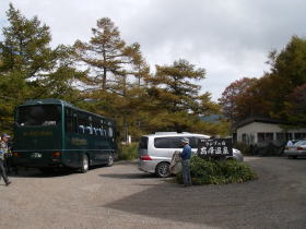 | 温泉の前で待っていてくれたバス。早速、高峰高原ホテルに向かう。 |