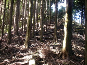 | 車道を歩かないで日向薬師のバス停に行けたらいいなと思って、石仏から東に延びる尾根に入ってみました。だがエボシ山と書いてるところで踏み跡がなくなってしまいました。午後2時を過ぎていましたので無理に進んで明るい内に下山できなくなるのを心配して戻ることにしました。 エボシ山から南に向かう踏み跡ははっきりしていましたので、大山のバス停あたりに出られるかも知れません。 |