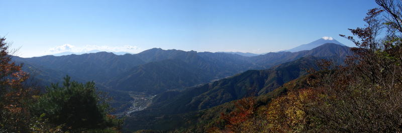 樹間に見える富士山。前景は御正体山。