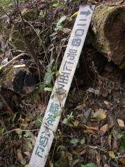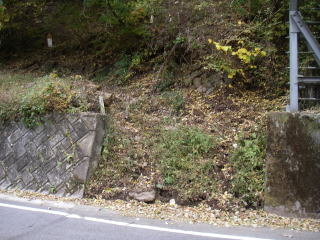| 竜門峡入口近くの登山口は道路の擁壁の切れ目にありました。二0四号に至るという鉄塔の巡視路の道標が立てかけてあるだけでした。 |
