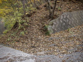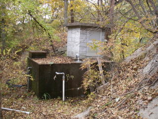 | 水道施設。ここで道はヘアピン状に曲がり尾根の反対側に付いていました。この道は沢を高巻くように付いているはっきりした道ですが展望の広場に至る稜線とはだんだんと離れてゆきます。どうもこれは水道施設への導水管を埋設する工事に伴ってできた道のようです。 これはまずいと少し進んだところで道を離れて稜線に向かって進むとはっきりとした踏み跡が現れました。水道施設のそばで稜線に取り付いた方が良かったのかも知れません。 |