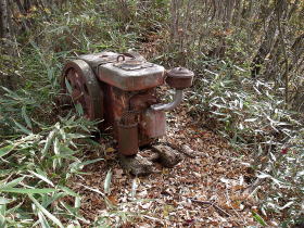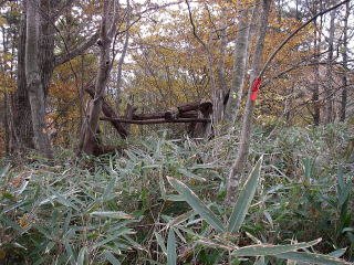| 西別尾根の分岐点。赤布があり、立木にペイントマークもありました。太い丸太で作った構造物の残骸もあり、ワイヤーで木を降ろすための施設だったのかも知れません。 |