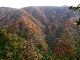 | 赤布は少しありましたが、道標はほとんどないコースで、踏み跡が見あたらず心配になることもありましたが、何とか予定のコースを辿り林道に出たときはホッとしました。 今回は私にとっては贅沢な山行で、前日に道の駅甲斐大和でご当地B級グルメの鳥もつ煮定食を食べ、景徳院で武田氏の滅亡を偲び、竜門峡を歩き、山形の山寺を小型にしたような栖雲寺の石の庭園を見た後、民宿に泊まりました。下山後にはやまと天目山温泉に入りました。紅葉真っ盛りの2日間を堪能できました。 |