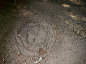 | 山門から本堂に至る岩を削って作った参詣道にある渦状の模様。どんな意図で作ったのだろう。 |