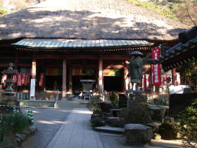 | 日向薬師本堂。茅葺の屋根が目立つ。ここで昨年と同様に新年のご挨拶。 |