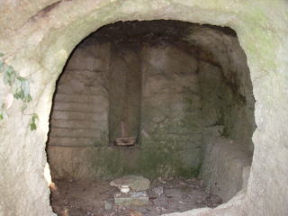 | 山頂近くにある以前は虚空蔵菩薩が祀られていたという奥ノ院の祠。渦状の模様のあった参詣道のように、ここも削りやすい凝灰岩のような岩だ。 |