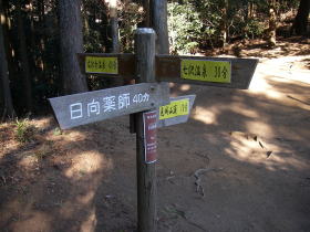 | 七沢温泉への分岐を示す道標。広沢寺温泉に向かう方を示す部分は追加されていて、新しい道のようだ。 |