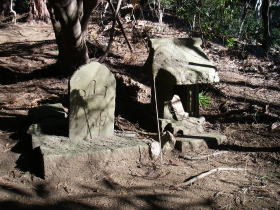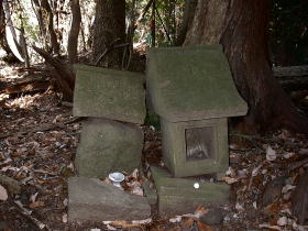 | 福神山との鞍部にある石祠。谷太郎川から登ってくるらしい道の赤布が見えました。 |