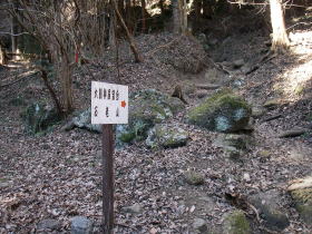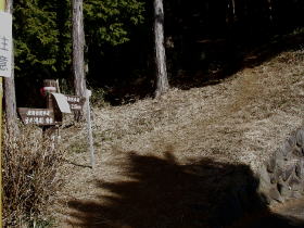 | 牧馬峠近くで林道に降りた所は、高さ1.5m程の石積みの擁壁が続く中の擁壁の切れ目でした。切れ目がなければ補助ロープを使う必要があったかもしれません。 |
