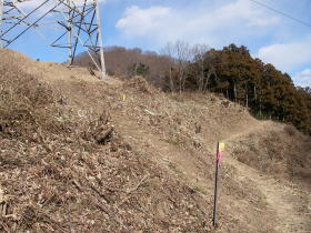 | 篠原に向かう道の途中から牧馬峠に向かいましたが、踏み跡は薄く、道標や赤布はなく、このような赤い杭が適度な間隔であって助かりました。 |