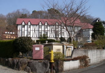| 七尾峠には綺麗に整備された道路が通り、立派なペンションもありました。ここで初めて岩戸山ハイキングコースという道標を見ました。 |