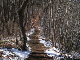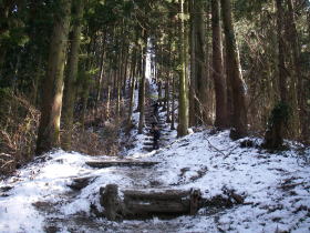 | 宝登山への登り。階段がありますが雪がついた急傾斜のステップもあり滑って歩きにくいところもありました。 |