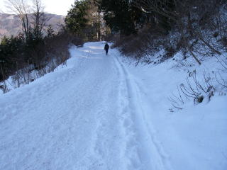 | 下りの道の日陰はすっかり踏み固められた雪に覆われ、滑りやすいところがあり恐る恐る歩きました。一部は昔の登山道らしきところに入って歩いたので少しショートカットをして下ることが出来ました。 |