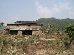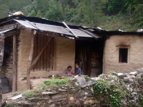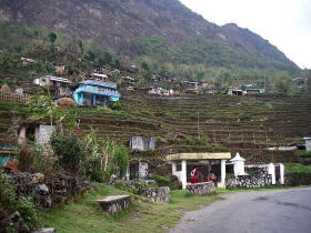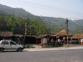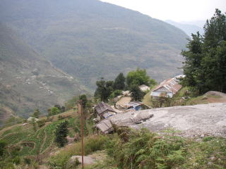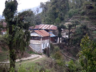 | Chandrakot の Hotel Nirvana で昼食。何軒かロッジのような建物がありましたが営業しているのはここだけでした。ここもアンナプルナの展望で有名なところだそうですが、道路ができたためトレッカーのルートが変わってしまった寂しさが漂っていました。またここにもポカラに通ずる道から分岐した道路が出来ていてバイクが来ていました。 天気が悪くアンナプルナの展望はまったくだめで、昼食中に雷を伴った雨が降りだし、なかなか出発できませんでした。 |