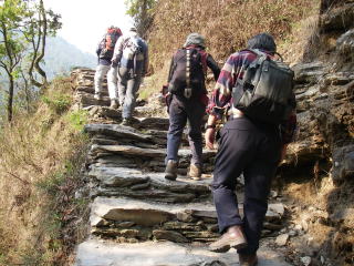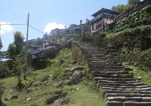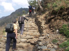 | このような石段の道を少し登ると、斜面を覆い尽くすように段々畑が広がるネパールらしい景色が見えてきました。 |