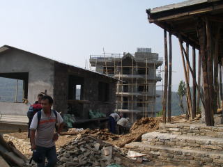 | 石段を登り尾根筋に出ると、ロッジやおみやげ店らしき建物の工事をやっていました。 |