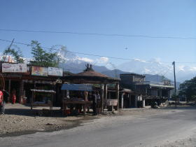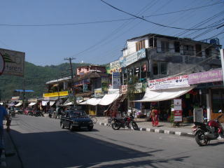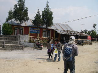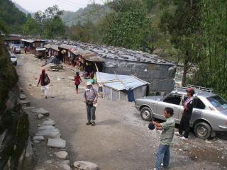 | PhediにはPokharaからタクシーで40分ほどで到着。ここでポータと落ち合い出発の準備。道の両側に飲食店があり、おみやげを売る人もいて賑わうところのようでした。 |