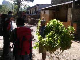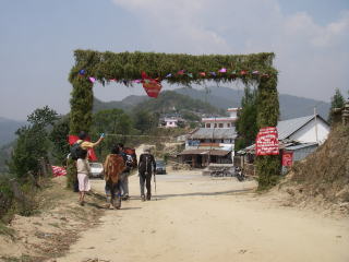 | Dhampusの中心に近づくと大きな道路が現れ、車やバイクも走っていました。車が通ると猛烈な土煙が舞い上がる道路です。何かの行事をやっているらしく、道には木の葉で飾られたゲートがありました。 |