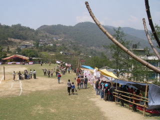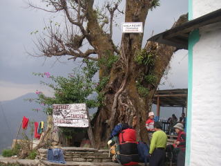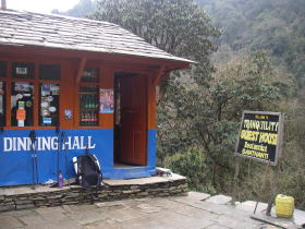 | お祭りの会場近くのPanorama Point Lodgeで昼食をとりました。注文した料理がなかなか出てこず、昼食に2時間もかかりました。トレッキング開始早々ネパールスタイルを思い知らされました。 2時間もかかりましたがDhanpusが好きで何度も来ているという若い日本人女性とのおしゃべりで余り長く感じませんでした。ひとりで来て現地の人たちに溶けこんでいる様子に感心しました。 食堂の壁にはアンナプルナの山々の展望の写真がありましたが、靄がかっって山はまったく見えませんでした。この先トレッキングルートは谷沿いを通るのでアンナプルナの展望はしばらくおあずけです。 |