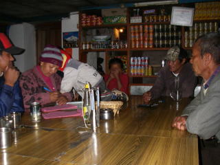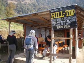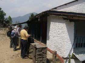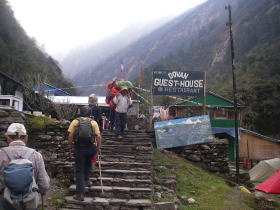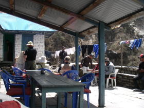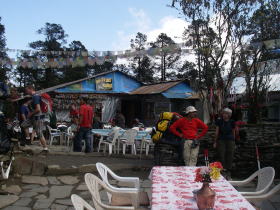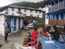 | Sinuwa の Sherpa Guest House で昼食。この間に雨が降り出しましたが 、出発するとすぐやみました。 |