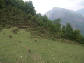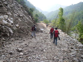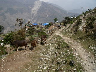 | Chandrakot へ向かう道のけっこう高いところにも家や畑がありましたが、Chandrakot に近づくあたりは歩く人が少ないらしく崩れて廃道のようになっているところがありました。 |