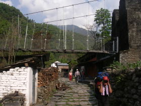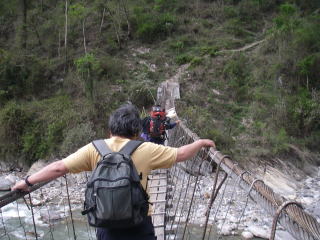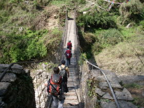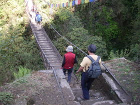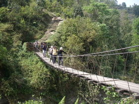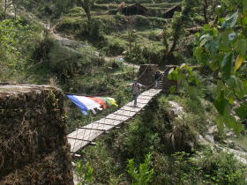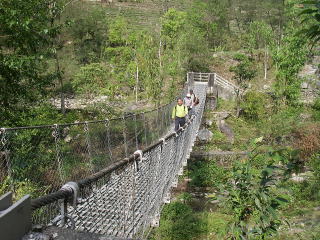 | Deurali からは谷に向かって下りこの吊り橋を渡りました。橋の名前を聞きましたが、ネパールには橋に名前をつける習慣はないそうです。 |