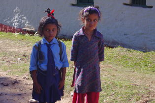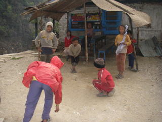 | New Bridge を渡ってからしばらく登った所の集落で子どもが遊んでいました。黒い玉のようなものを使っていたのでビー玉のようなものかもしれません。 |
