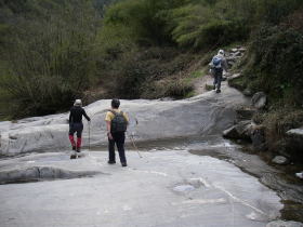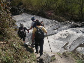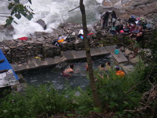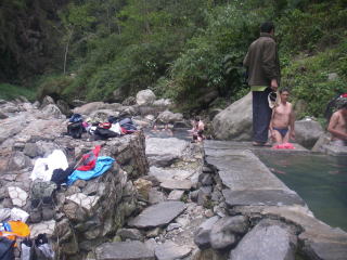 | Jhinudanda に到着後しばらくすると雨がやんだので温泉に行きました。温泉は宿から歩いて下り15分、上り25分位の河原にあり、コンクリート製の浴槽が3つで、脱衣場もありました。管理人がいて外国人からは利用料を集めていました。 |