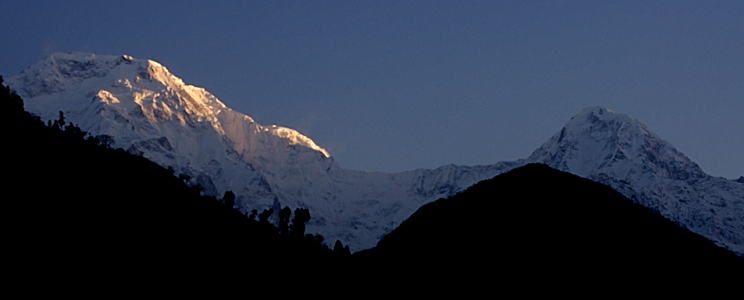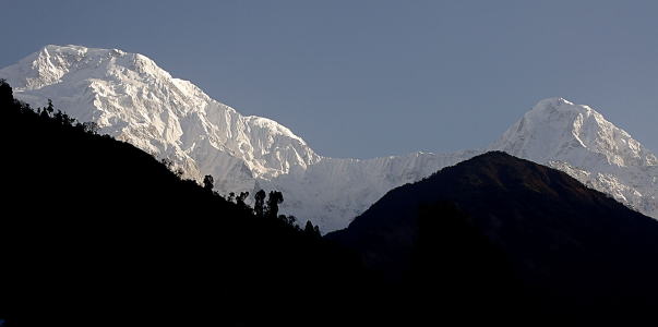 | 日が差しても Machhapuchhare はシルエットのままでしたが、白く輝く雪の山も見えました。 |