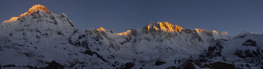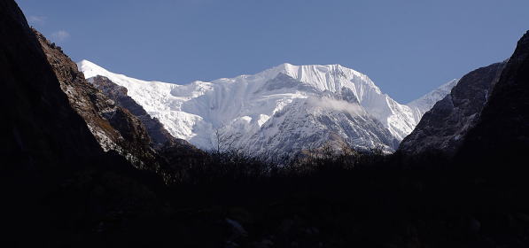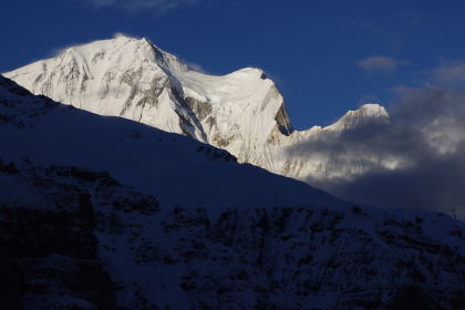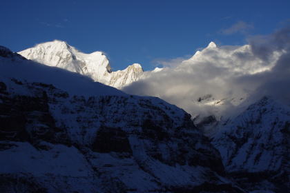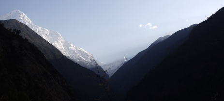 | この日の朝は好天で、Annapurna South と Hiun Chuli にだんだんと陽が当たって行く姿を見ることができました。ルートは深い谷沿いにあるので広い範囲の山を見渡すことはできません。 |