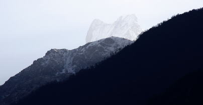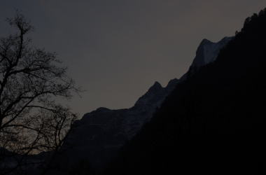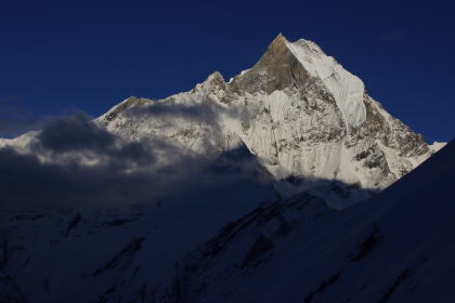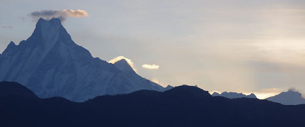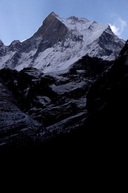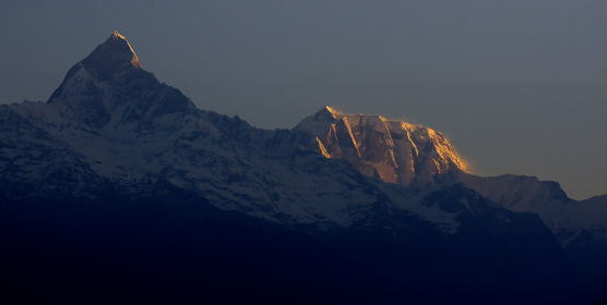 | 空が明るくなり始めた頃、深い谷の壁から Machhapuchhare がちょっとだけ頭を出していました。 |