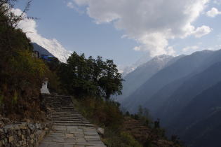 | Chhomrong のルート中の最高点付近の景観。雲がかかっているが遠くの山が見えてくる。 |