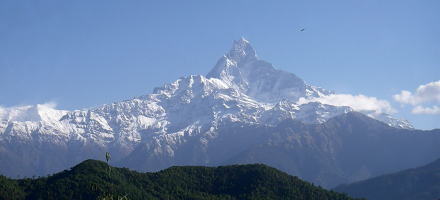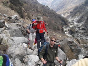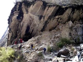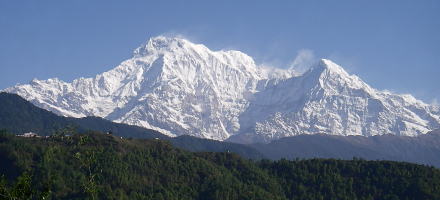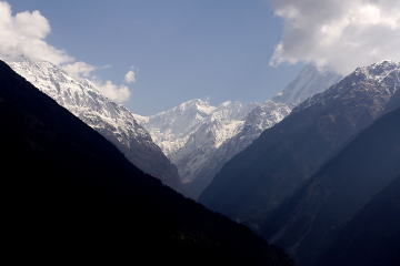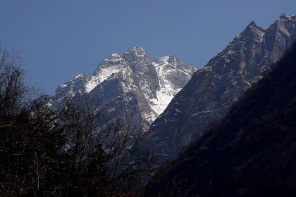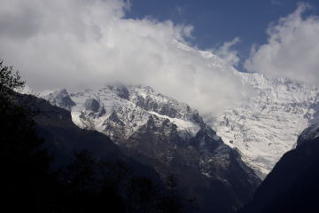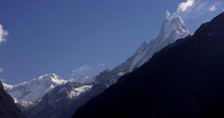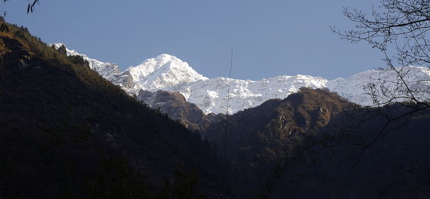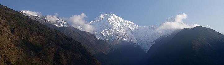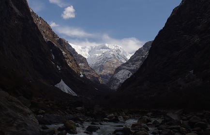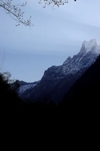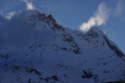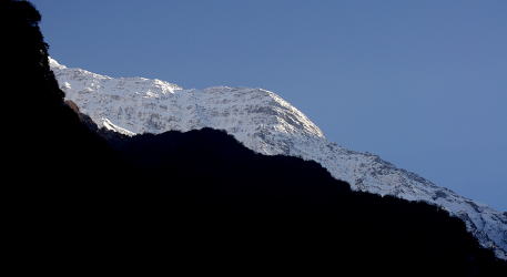 | 宿泊したロッジ付近からはアンナプルナの山は見えませんでしたが、歩き始めてまもなく『雪崩危険地帯』という案内があり、そこから迂回路をたどると河原に出て,左岸に渡ると見えてきました。太陽の位置の関係で Machhapuchhare はシルエット気味でしたが見えました。 |