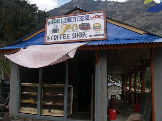 | 私の誕生日を祝うためのケーキを買いにChhomrong のベーカリーに行くと、ショートケーキはありましたが数が足りません。直ぐできるというので休憩場所に届けてもらうことに。 |