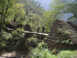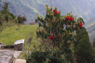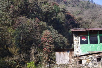 | Tolka からまた石段に道を下り、吊り橋を渡り Landruk へ。Landruk では Hotel Sherpa で昼食。ホテルで途中で撮った花の写真を見せ名前を聞いたが、花には全く興味がないようすで分からないという返事でした。 |
