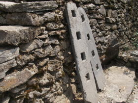 | Sinuwa で見かけた石の板。道の両側に立て、四角い穴に棒を通して放し飼いの牛が通れないようにするための板だそうです。 |