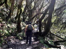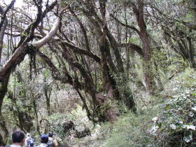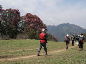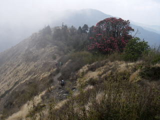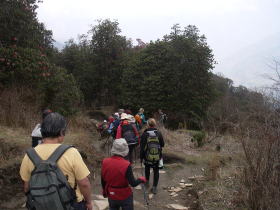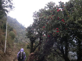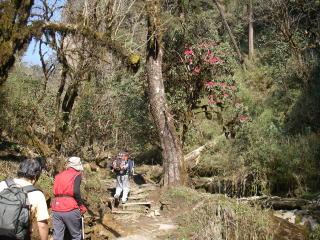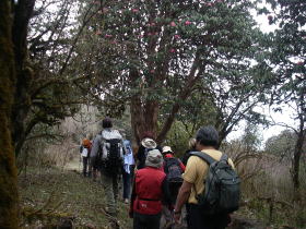 | 巨大なシャクナゲに取り囲まれているような道を Ghorepani に向けて下る。 |
