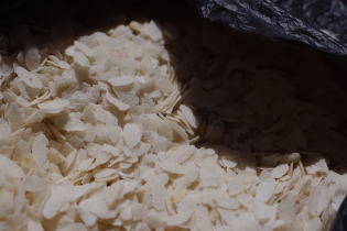 | Himalaya Hotel で休憩したときにガイドが出してくれたチウラ。炊いたコメをつぶして乾燥させた物。そのまま食べることもできるし、水分に浸してたべることもできる。アルファー米みたいな物。 |