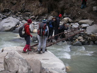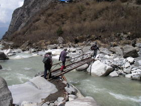 | 雪崩を避けるための迂回路からこの橋で右岸に戻ったあとも谷はアンナプルナの方には開けていて、雪で輝く山を見ることができました。 |