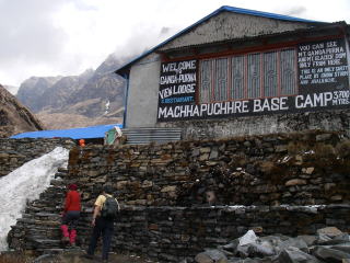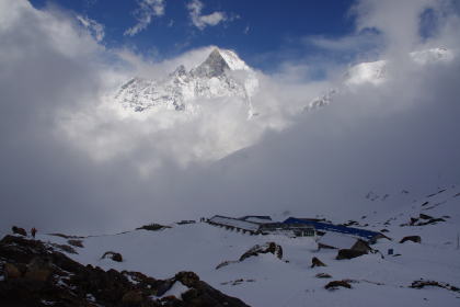 | Machhapuchhare Base Camp に到着。Machhapuchhare には雲がかかっていましたが、山頂が見えた瞬間にパチリ。 |