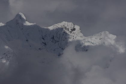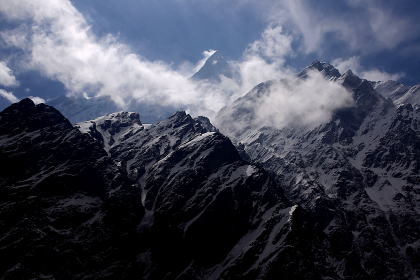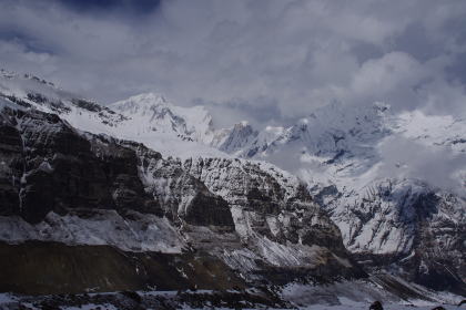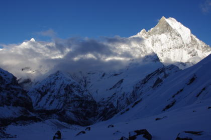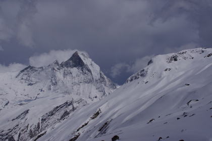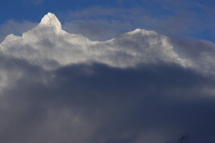 | A.B.C.に向う途中 Machhapuchhare が気になって何度か振り返ってみると雲の切れ間にほんの短い時間だけ見えた時がありました。 下の方の大部分が雲に覆われているためでしょうか、遠近感が失われ、私の方に覆いかぶさってくるような迫力を感じました。 |