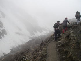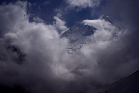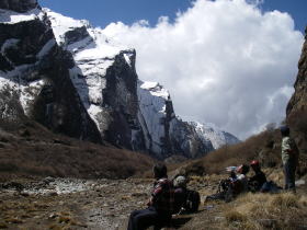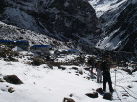 Ⅰを一度も見ていないのでA.B.C.にもう一泊することにしました。 雪は夕方まで降り続き、積雪は15cm程になりましたが、5時半頃になってやっとM.B.C.方向の雲に切れ間ができ山が見えてきました。でも相変わらずAnnapurna Ⅰの方は雲に覆われたままでした。 |