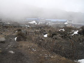 | 昼前に到着したので時間を持て余し、ガイドやポーターは洗濯をして裏庭に干していました。 天気は芳しくなく、雨が時々降り、時には大粒の雹が降り、すごい音がして怖いくらいでした。 ロビーには大きな薪ストーブがあり暖かく過ごすことが出来ました。 |