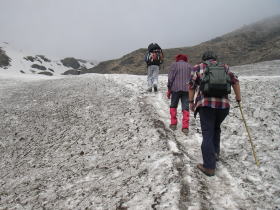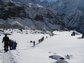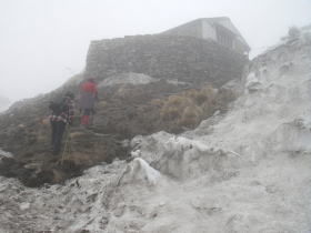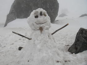 | 昼近くにA.B.C.に到着しました。しばらくすると雪が降り始め午後3時頃まで降り、2cm程積もりました。 |