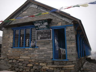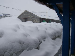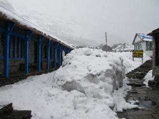| 朝起きると雪が降っていて、直ぐ止みそうな気配はありません。なお朝6:00の気温は0℃でした。雪は昼近くになっても止まず、まだAnnapurna