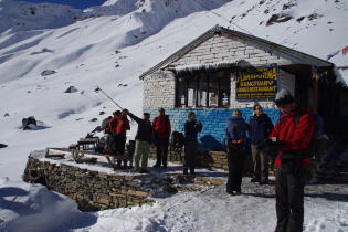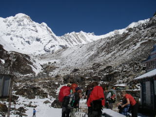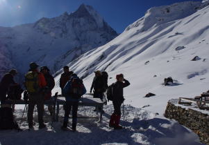 | このトレッキングの目的の一つだったA.B.C.でアンナプルナの山々の展望がこれ以上望めないほどの好天のもとででき、無事ここまで下山できたことと、この日がネパールの正月であることを祝って、夕食前にガイド、ポーターを含めた全員でビールで乾杯し、日本から持参した餅を食べました。 |